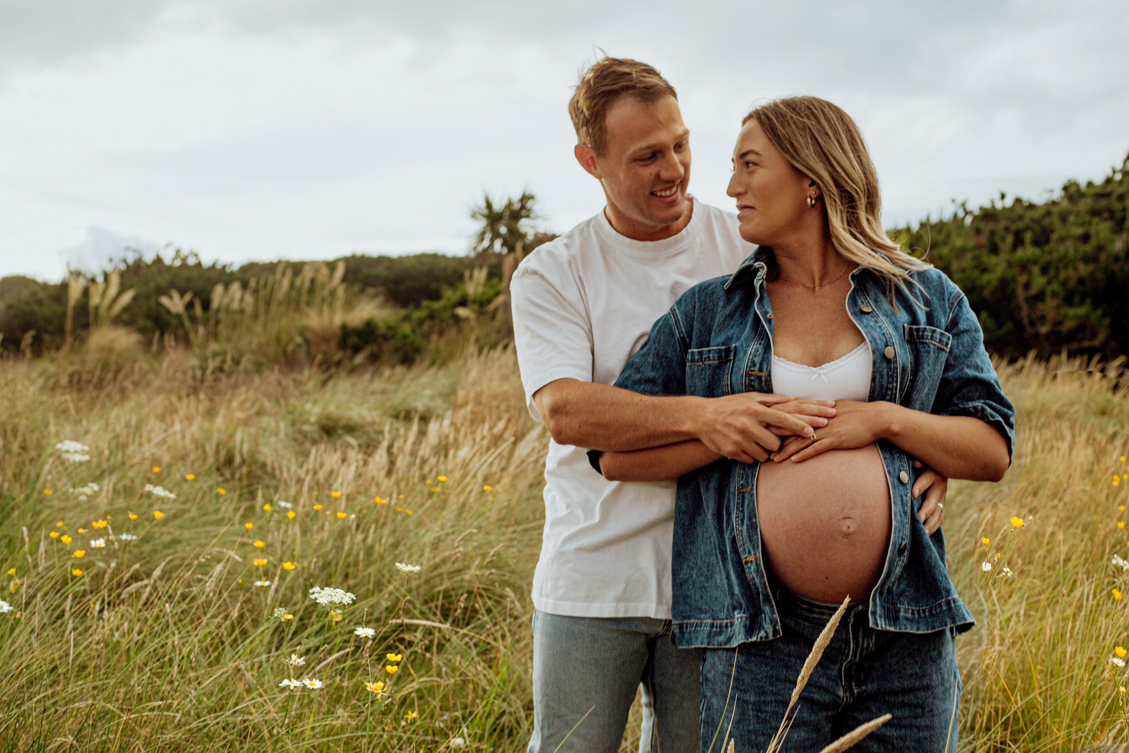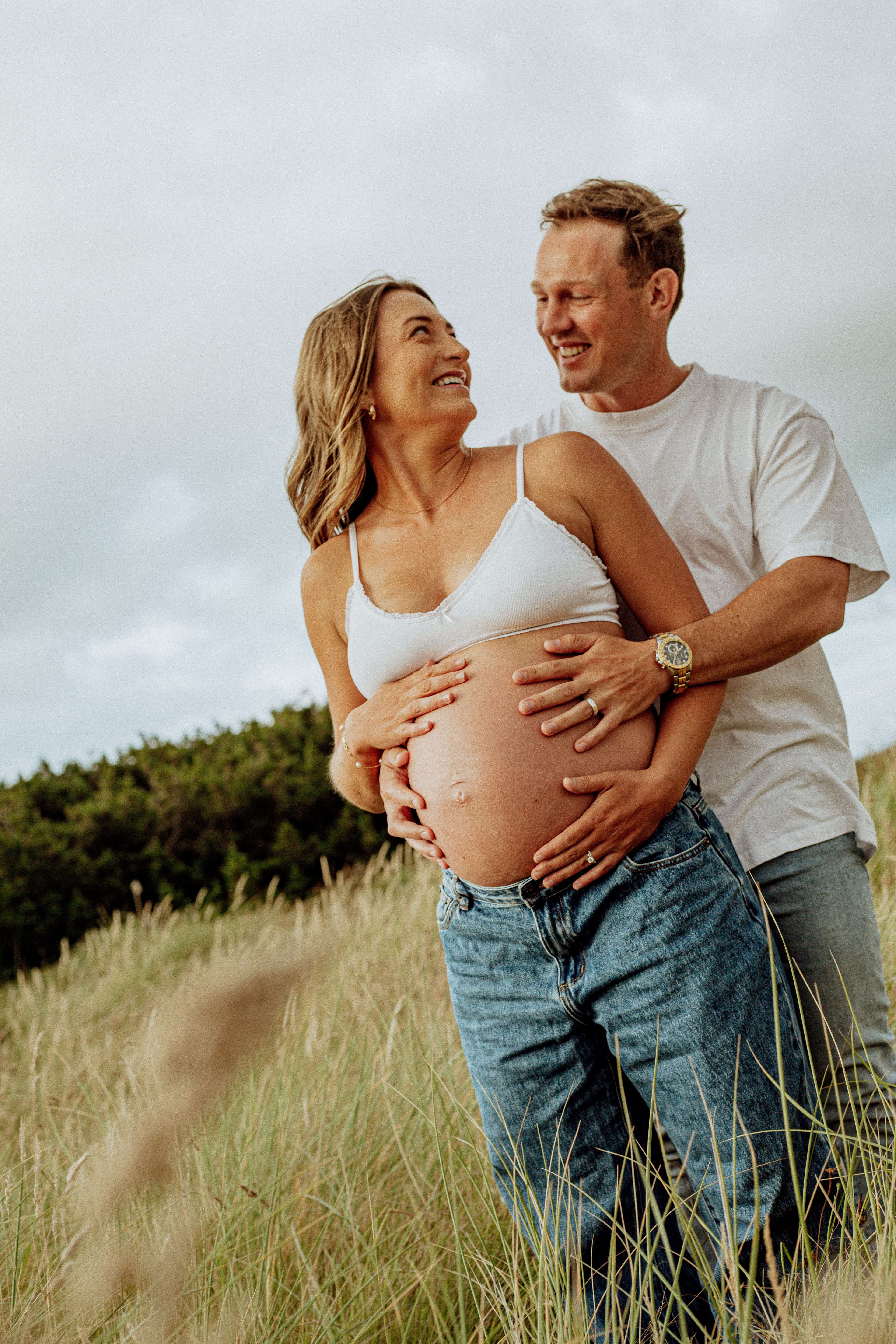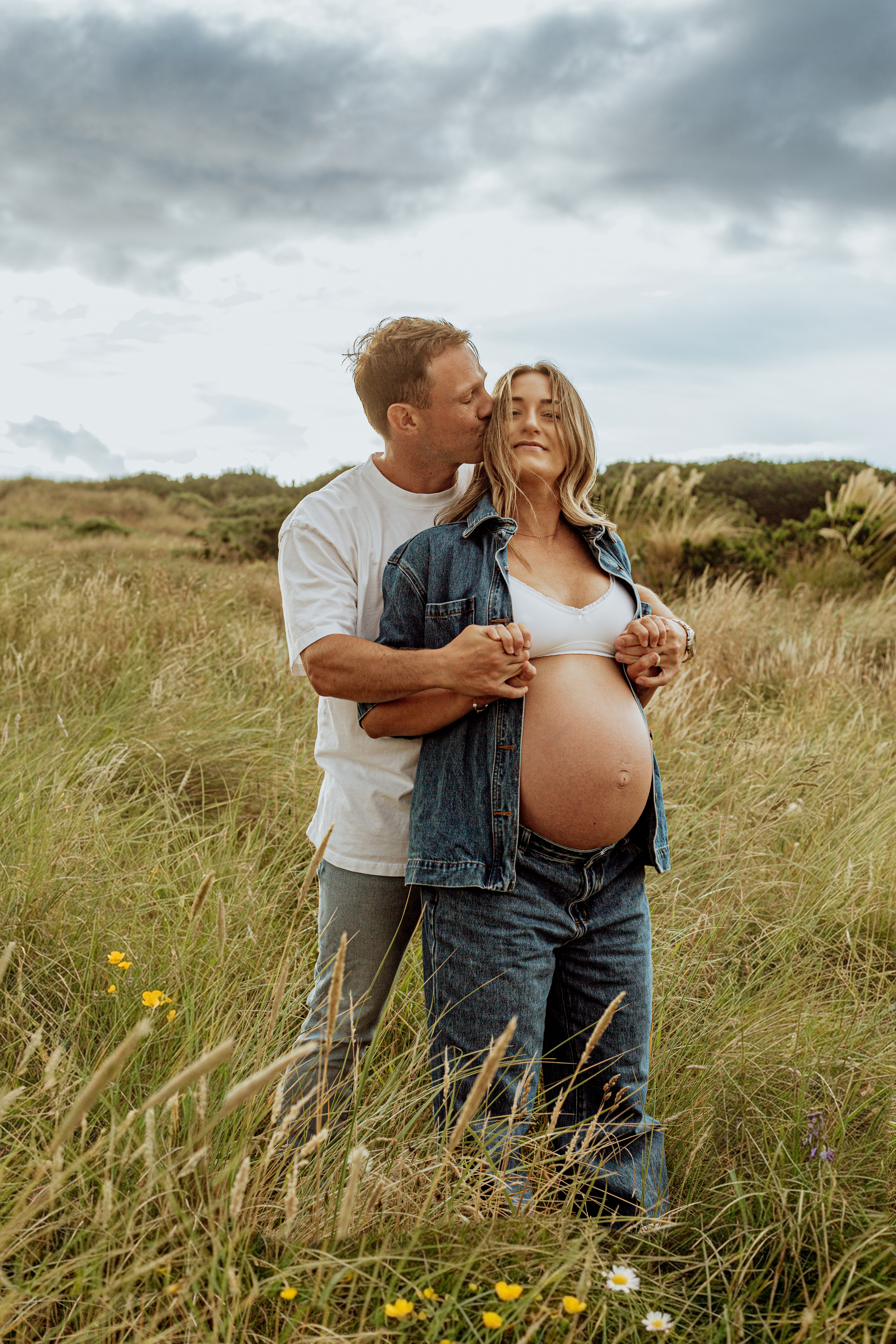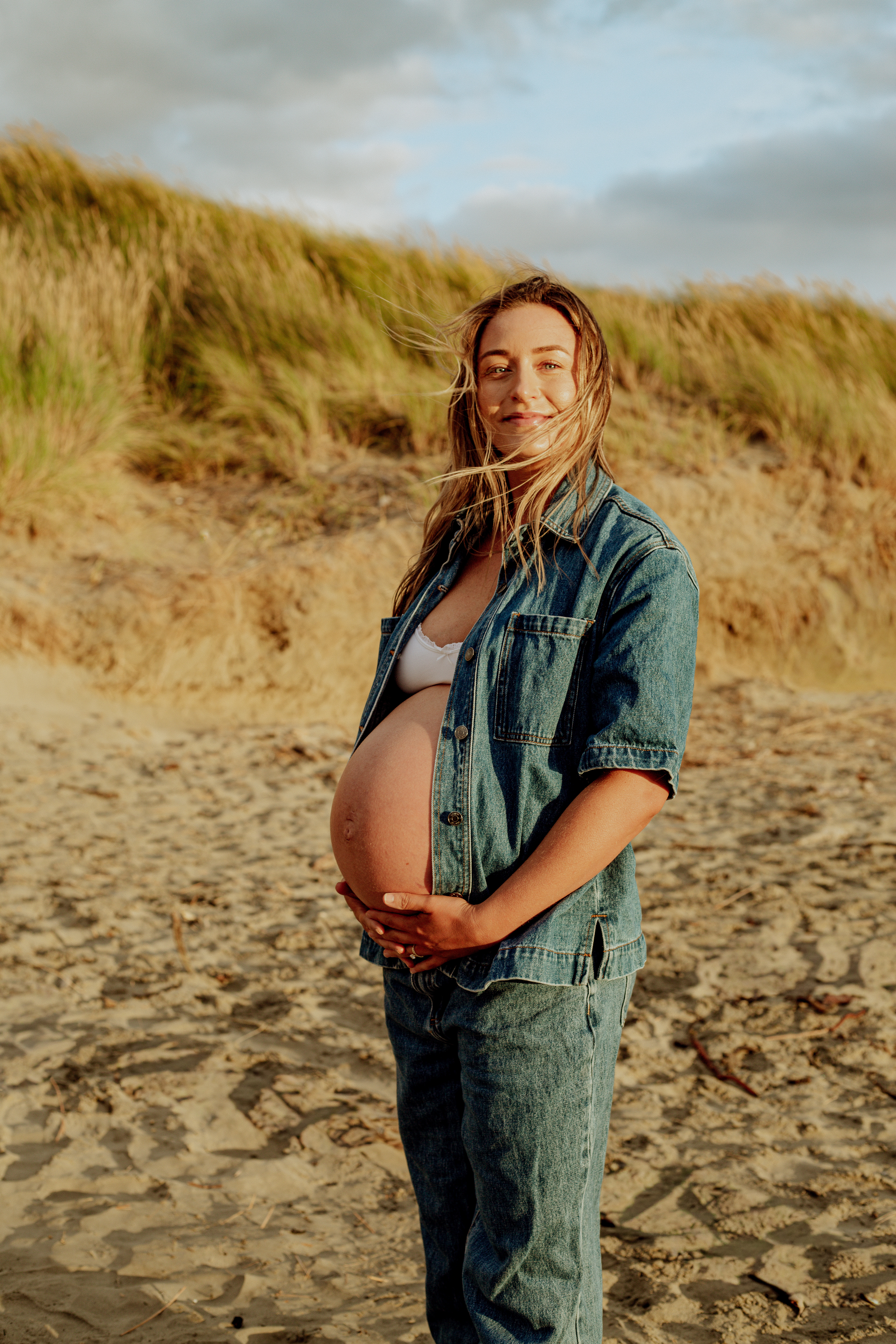 A sunset maternity session with the Howleys, filled with warm light, soft tones, and the quiet excitement of a baby on the way. Southland weather can be unpredictable, and this evening was no exception. After a day of watching the skies and checking conditions in Ōtātara, the clouds finally cleared and the sun broke through at exactly the right moment. The result was that perfect golden glow, gentle, flattering, and full of warmth. Set against the sand and sea, the session felt relaxed, joyful, and deeply connected. A beautiful way to pause, soak in the moment, and celebrate this season before their family grows.